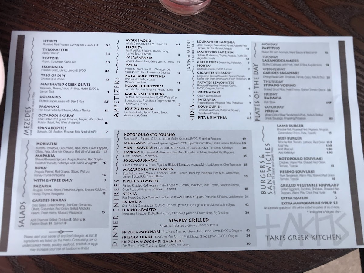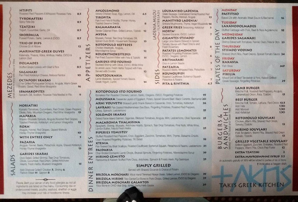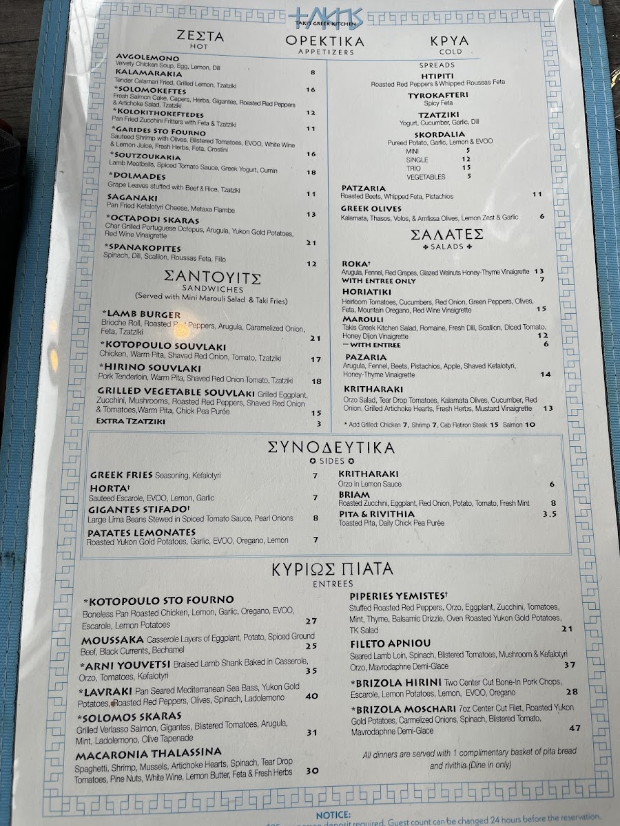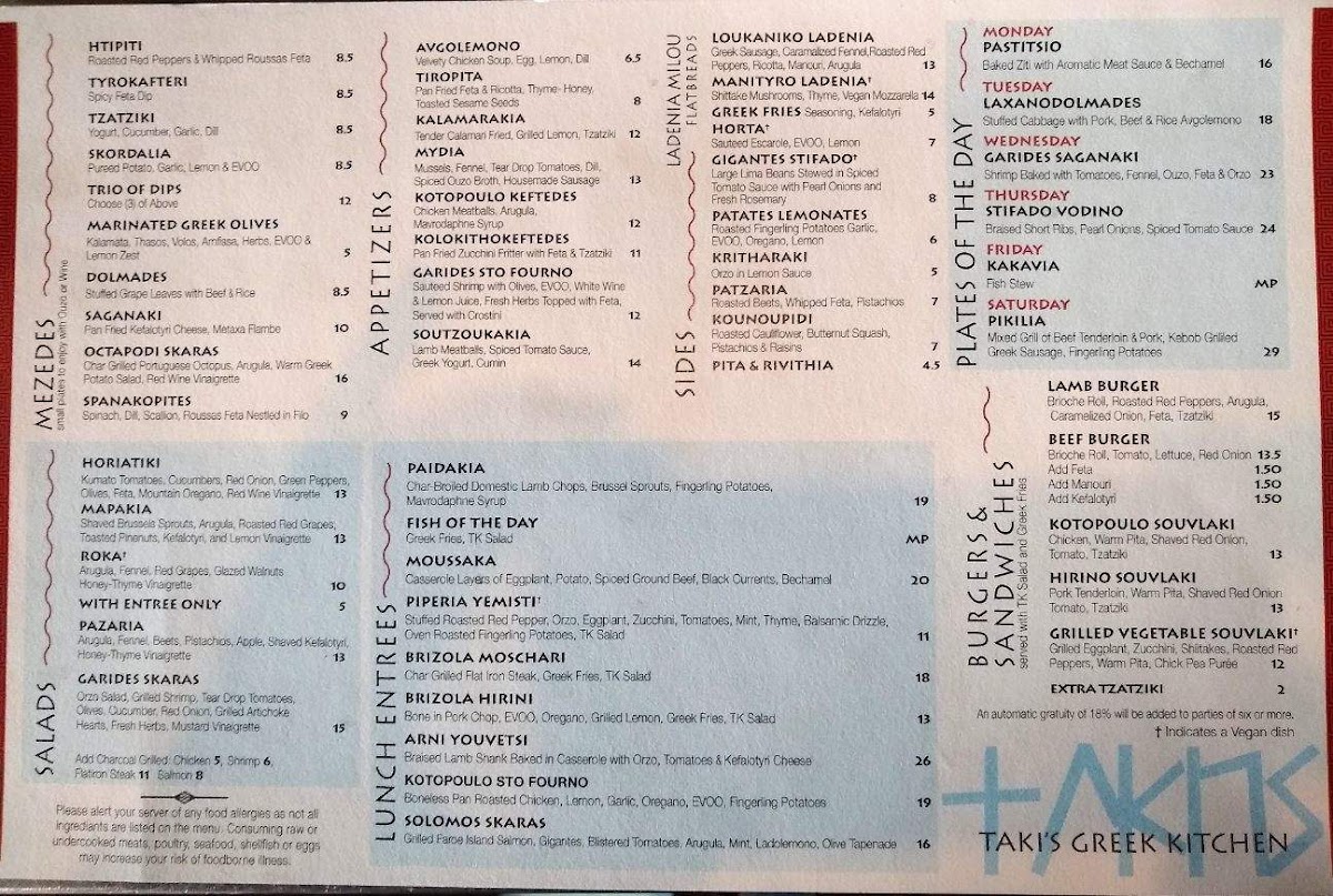 Taki's Greek Kitchen, located at 377 Lear Rd in Avon Lake, OH, offers a diverse and delightful menu, capturing the essence of traditional Greek flavors with a modern twist. The menu is divided into several sections, making it easy for guests to find their perfect meal.