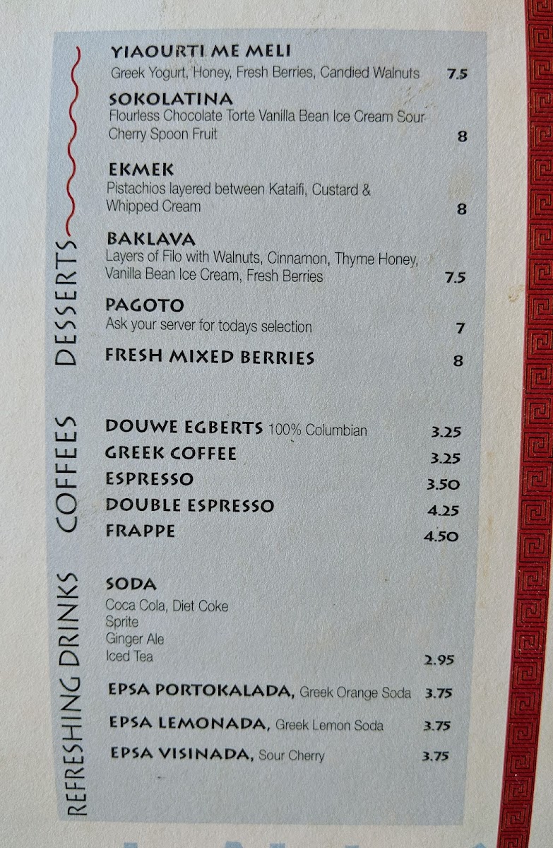 The restaurant offers daily specials that bring even more variety. On Mondays, indulge in Pastitsio, a Greek lasagna-style dish. Tuesdays feature Laxanodolmades (stuffed cabbage rolls), while Wednesdays bring the savory Garides Saganaki (shrimp saganaki), a dish rich with feta cheese and ouzo. Fridays are perfect for trying Kakavia, a Greek fisherman’s stew, and Saturdays introduce Pikilia, a mixed platter of Greek delicacies.