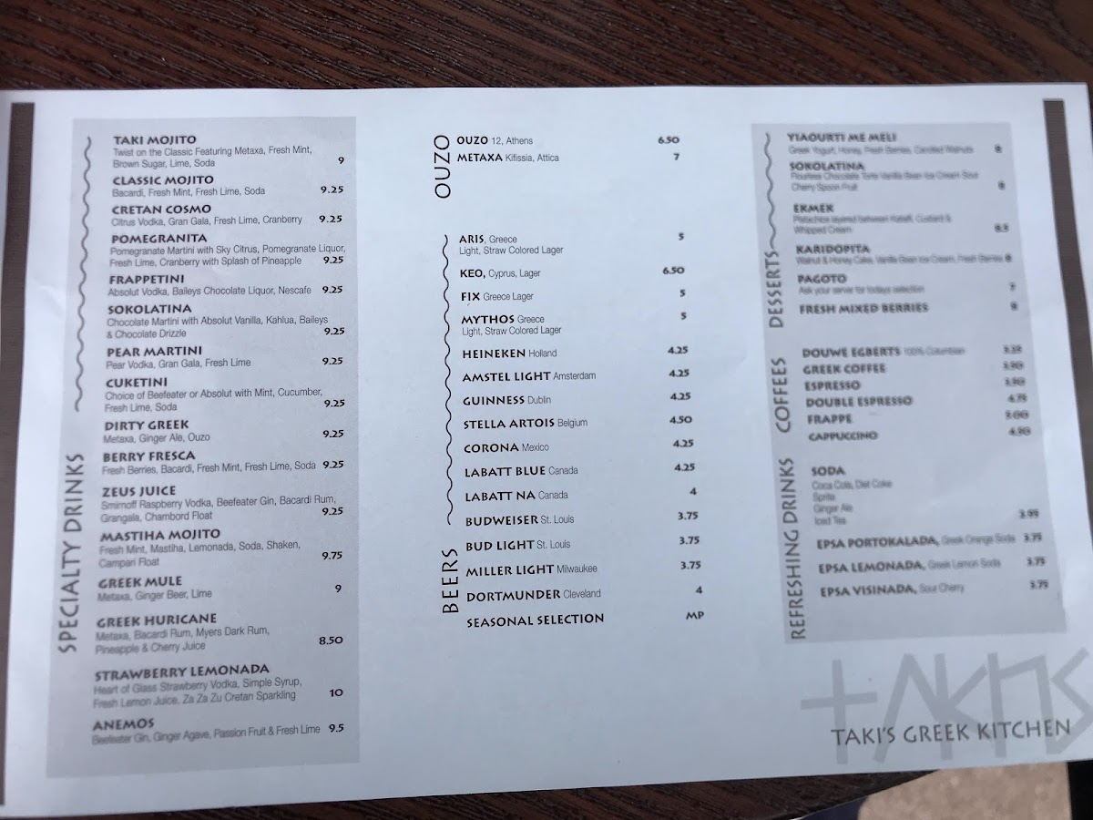 No meal at Taki's is complete without a refreshing drink or dessert. The Mastiha Mojito and Greek Mule are refreshing cocktail options, and the Fresh Mixed Berries offer a sweet, light finish to your meal.